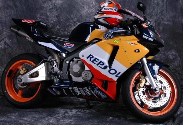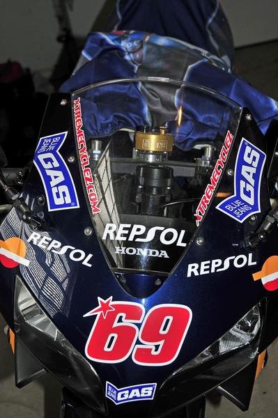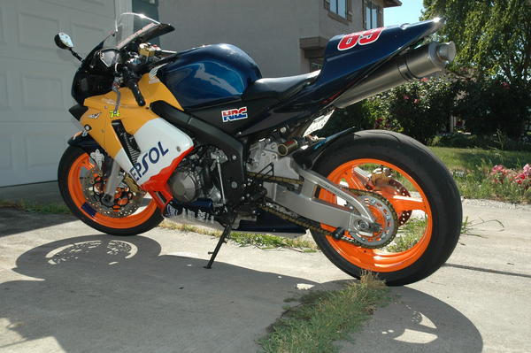custom paint, D3 grips, Lawst Caws frame plugs, BMC air filter, Honda Pro velocity stacks, Sato rearsets, full titanium Arata race exhaust, pcIII, greggs customs flush mounts, integrated rear, CRG levers, RNK gold chain, steel braided lines, powder coated rims, DB Smoke screen, Scotts steering damper, and custom seat cowl. Nicky Hayden's signature