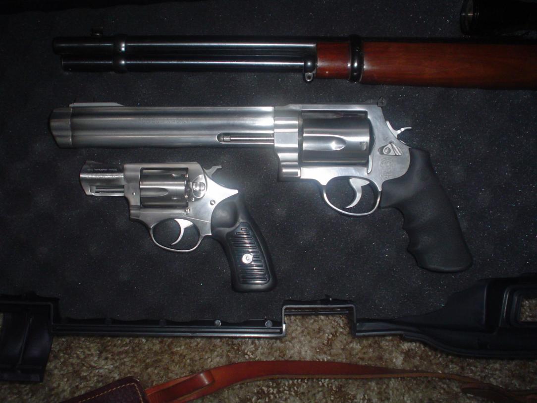 This one is Dirty Harry approved for sure. S&W 500 Mag. Sitting below it is a Ruger SP101 357 with a 2" barrel.