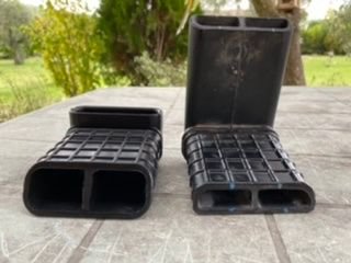 Standard KLX250 EFI airbox inlet pipe on the right. Cross sectional area is around 720mm2 (1.12inch2). The new replacement inlet pipe (on the left) is from a KDX200/KL650a (part number 14073-1577) and has a cross sectional area of around 1550mm2 (2.4inch2).