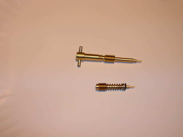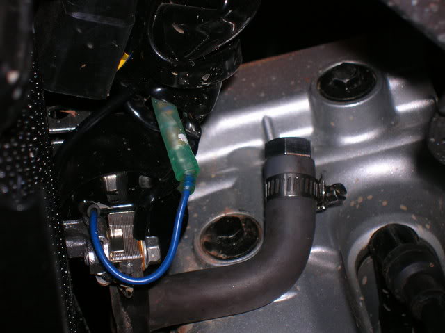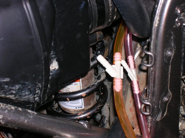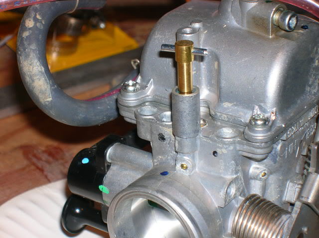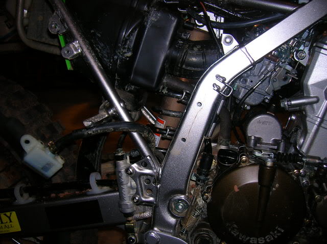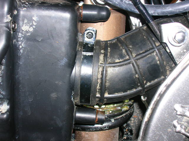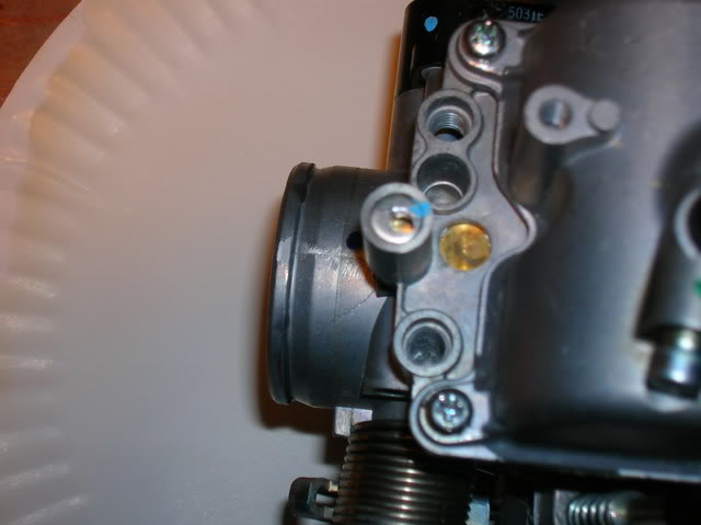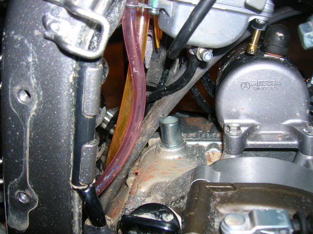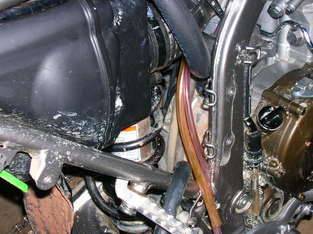 I followed the disasembly instructions on this site and they were excellent!! http://www.hmfengineering.com/forums...ead.php?t=1617 Follow it line by line for carb mods / carb access and you won't be disapointed!! Once I got the seat, srouds and gas tank off, my first job was to get rid of the smog crap (KCR Air Suction System). Attachment 33071 after I got that bad boy off: Attachment 33072 It was time to get the Carb out. following the above site's instructions, I detached the Carb TPS system at the connection: Attachment 33073 I pulled the Carb breather lines out from the frame holder and un-coupled the throttle cables. I also moved the rear break resivor out of the way so I had more room to work. Attachment 33074 I was then able to undo the soft plastic boots from the air box and engine intake and pull the carb right up through the hole where the seat was. Attachment 33075 This is what the Carb should look like with the proper tubes and wires attached when you take it out: Attachment 33076 The first plug I did was on the carb, plugging the carb vacume port to the KCR Air Suction System. Attachment 33077 Next I took off the float bowl and changed out the stock main jet (right) toa #130 and the pilot (center / inbedded) toa #40. Attachment 33078 Once that was done, I replaced the float bowl, turned it over and quickly opened the slide housing, drilled the slide breather hole 7/64ths and tossed the slide in hot water to keep the diaphragm from expanding. I got the new needle ready, with the clip on the second notch with the collar. Attachment 33079 I pulled the slide out of the hot water, dried it off, and put it back in the carb. then droped the needle (with clip and collar in place)into the slide (making sure it went into the main jet holder) and then put on the plastic spring holder, the spring and put the top back on. I did this quickly to avoid the diaphragm expanding. The hot water worked great, and it stayed the correct size. Next I turned the carb back over (upside down again) and poped out the pilot adjustment screw cap by drilling it very carfully, then using a screw to pop it off: Attachment 33080 Attachment 33081 Attachment 33082 Once the cap was off, I screwed the screw in all the way to see what it was set at. (1 full turn). I then took out the screw and replaced it with the Kouba adjustable screw for easy adjustments once the carb is back on: Attachment 33083 Attachment 33084 the Carb mods were now done, so it was time to finish the plugging job from the KCR Air Suction System and to get the carb back on the bike. All I have to do now is put it all back together....... Attachment 33085 I ended up leaving the entire piece of tubing from the KCR Air Suction System from where it attached to the exhaust manifold to where it had attached to thesensor. This way I figured I could put it back together if I had to for inspection. In the meantime, I simply used someone elses great suggestion and put a bolt and circle clamp on it so that it would be sealed but not melt like a cap might that close to the engine head: Attachment 33086 Attachment 33087 I then just tethered it to the wire harness above so that it wouldnt rattle when I was riding. Next I sealed up the vent holes in the air box, one with a cap outside (forthe KCR Air Suction System hole on top) and one with a cap inverted and pushed inside (for where the crankcase vent hose used to be) for both, I used a sealer to keep them air tight and in place. Attachment 33088 I then had to re-route the crankcase vent to the top of the air box ala the "Nobrakes" method since that method allowed the crankcase to still get the air it needs (vs sealing it off) and also put the opening way up top, so short of full submersion, there should be very little water getting into the engine crankase!! Attachment 33089 I ran a 5/8ths inner diameter tube up from the cankcase opening and put it aside for the time being soI could finalize the airbox filter and lid assembly. I was having the darndest time getting that air filter box to fit......;) Attachment 33090 Man what a differnance the High Flow snorkel makes!! It lets so much more air in due to the much larger openings and much shorter distance that the air has to travel compaired to the stock snorkel... Attachment 33091 Attachment 33092 Eventually I got that K&N air filter in!! Attachment 33093 And with the lid attached again sporting the High Flow snorkel, I was ready to "Nobrakes route" the crankcase breather: Attachment 33094 At first I routed it incorrectly accross the base of the frame where the seat clips in, I later had to change that position but was still able to stay up top!! Attachment 33095 Attachment 33096 Next on the list (based on access still available!!) was completing the Carb breather "T" mod. This was very strait forward and I ended up using a Y connector from an Autozone store along with some windshild washer 5 mm tubing: Attachment 33097 Attachment 33098 I routedthe secondary carb breather line |