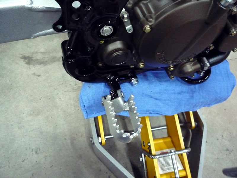 Attachment 13589 Since the engine was kind of in my way, I hurried up and installed it back in the frame. Attachment 13590 Next, I put new bearings, collars and seals in the swingarm, then mounted it in the frame. Attachment 13591 Attachment 13592 Attachment 13593 The triple clamps I decided to paint. Anodizing cast aluminum is hit-or-miss. Blacks sometimes come out as purples. I used Eastwood aluminum radiator paint in a 20% black. Since the triple clamps aren't a high-wear area, it will work fine. Then I put in new headset bearings and installed the triple clamps. Attachment 13594 Attachment 13595 Attachment 13596 Next, the footpegs, swingarm linkage, and wiring harness went back on. Attachment 13597 Attachment 13598 Attachment 13599 The wiring harness has to go on now because it runs under other parts like the airbox. |