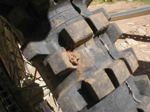 Nobrakes, that's definitely right on the use of a plug. I pulled that nail out and the Stan's tubeless sealant seemed like it would seal the nail hole. However, not wanting to risk it, I put a plug in the hole 10 minutes later...see pic. I wore that tire out with the plug in place with no problem.