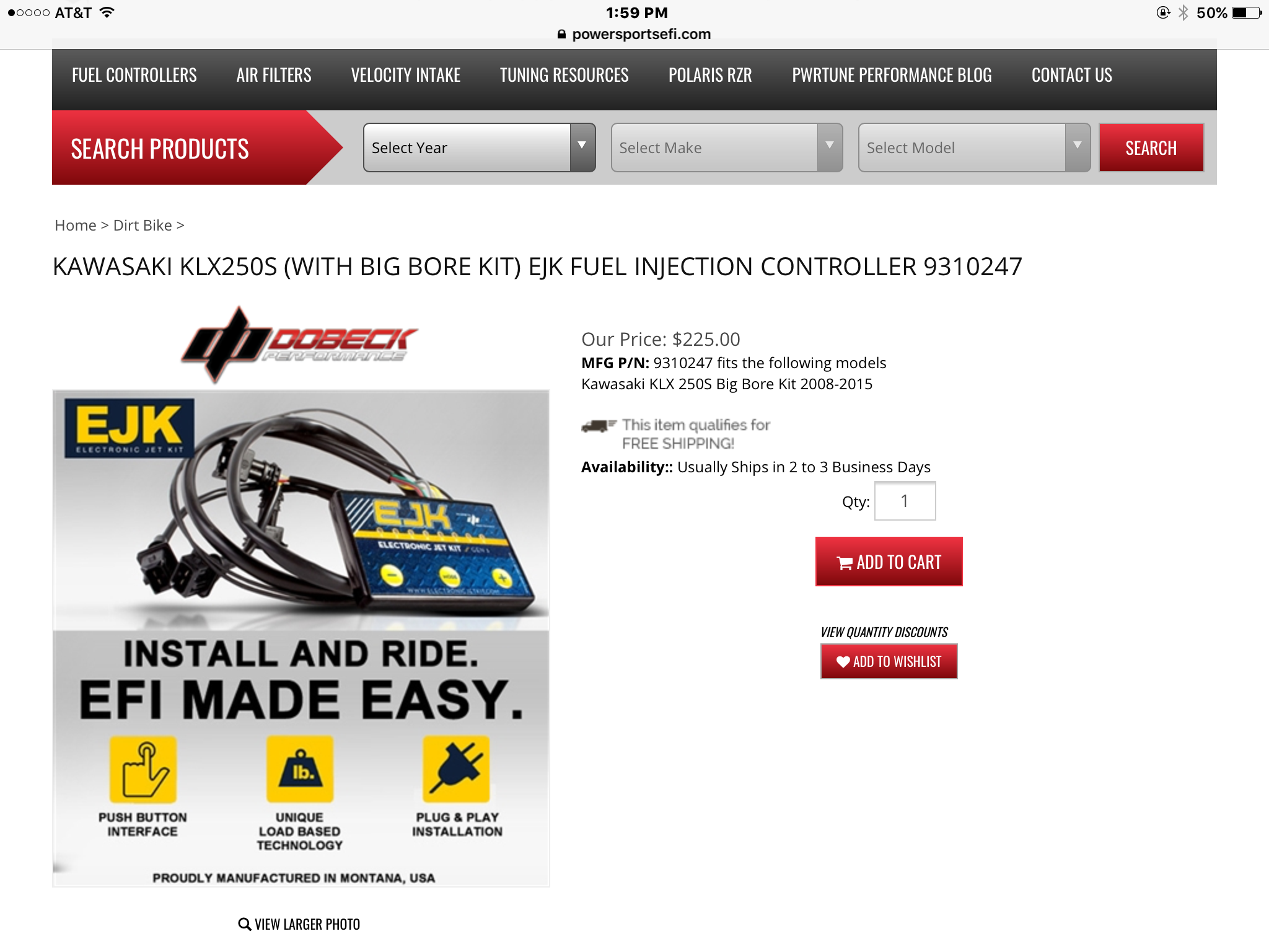 I recently fitted Bill Blue's 351 kit to my KLX 250S EFI bike, with EJK controller provided with the Bill Blue kit, and for everyone's benefit I can share my sad experience with it: bike hesitates to startup which is one problem, but even bigger problem is that reving up to 6-8k rpms and releasing throttle it dies out. My mechanic and I spent 3 hours trying out all sorts of EJK settings, but no chances of resolving this problem. I contacted Bill, he was quick to pick up the phone, but couldn't help me on this, saying he's not a fan of EFI (what kind of answer is that for someone distributing EFI kits?). Contacted EJK asking for recommended settings on the controller - no response. I tried raising rpms, taking airbox lid out, unplugging stock exhaust to see if any of it helps to get rid of stalling issue - nothing helps. Having spent ~1000 eur on this upgrade (I'm in Europe, so customs taxes are applicable), and 300 more for mechanic work, I just wanna cry for being so naive! For those of you thinking of fitting 351 kit on KLX250 EFI, consider other options out there.. perhaps 292cc upgrade might work better, I hope.