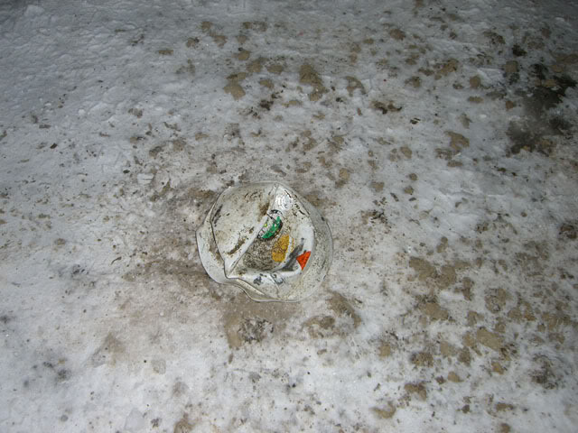 also without a "head" for the webbing to distribute the weight to, equally - it isn't even functioning right. Sitting on the ground like that - a hardhat is probably at it's 2nd weakest, only to being inverted and sitting on the ground.