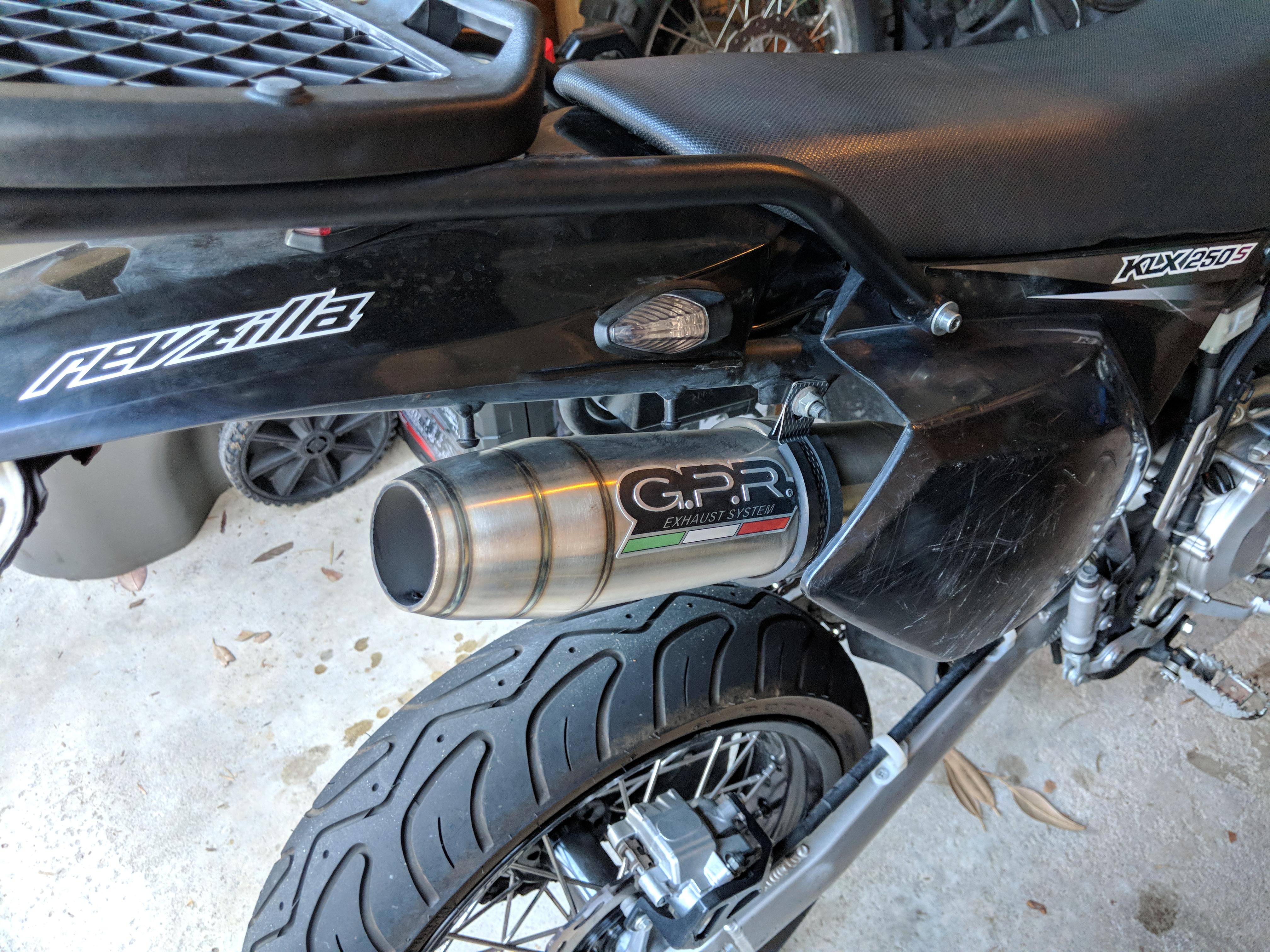 This exhaust came with my 09 KLX250 but it is too loud for my taste. Has a nice deep sound. A little dirty but no damages.