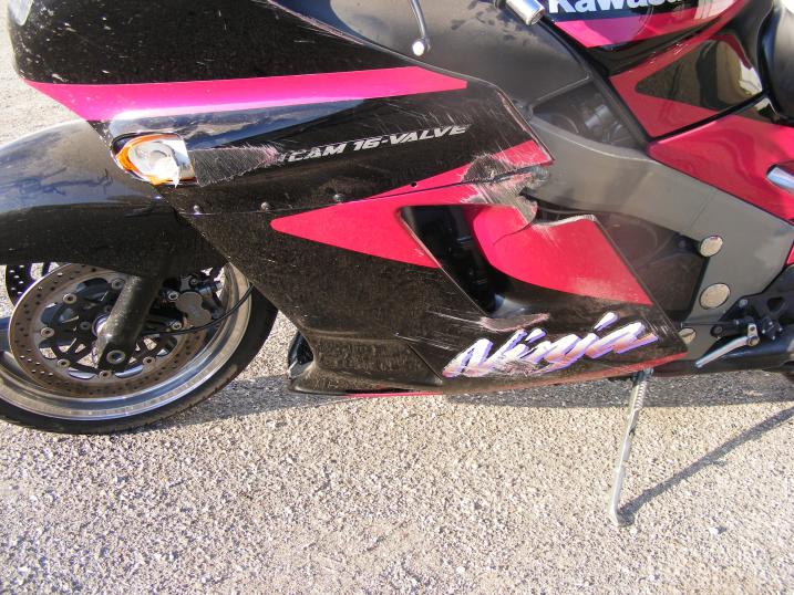 Minor damage/scrapes to left side fairing, mirror and exhaust due to low speed layover. The front brake siezed up, freak accident i guess but the brake has been repaired.